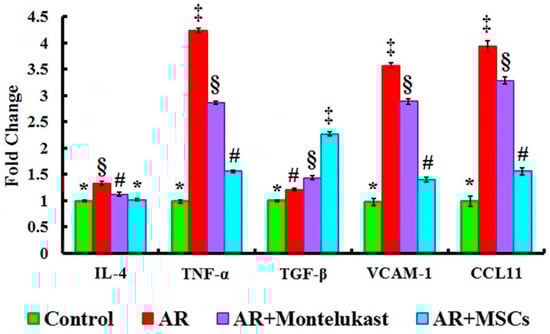 Quantitative analysis for relative IL-4, TNF-α, TGF-β, VCAM-1 and CCL11 genes expression after the indicated treatment with Montelukast or MSCs. Different superscripts (*, #, §, and ‡) at the same check point to significant differences at p < 0.05. Data are shown as mean ± S.E.M, n = 5.