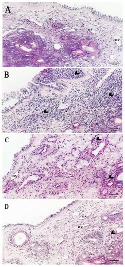 (A) A photomicrograph of a section in the nasal mucosa of group I (control group) displaying normal nasal mucosa with respiratory epithelium (E) resting on thin basal lamina (arrow) and lamina propria of loose connective tissue having multiple blood vessels (BV) and seromucinous glands (G). (B) A photomicrograph of a section in the nasal mucosa of AR group (Group II) showing impairment of respiratory epithelium (E) resting on apparently thick basal lamina (arrow) and lamina propria with infiltration of abundant cells (arrow head) and with few blood vessels (BV). (C) A photomicrograph of a section in the nasal mucosa of Group III displaying partial damage of respiratory epithelium (E) resting on apparently thick basal lamina (arrow) and lamina propria with infiltration of a few cells (arrow head) and with few blood vessels (BV). (D) A photomicrograph of a section in the nasal mucosa of Group IV displaying near normal nasal mucosa with overcrowded respiratory epithelium (E) resting on apparently thin basal lamina (arrow) and lamina propria of loose connective tissue having infiltration of a few cells (arrow head) and having many blood vessels (BV) [H&E × 200].