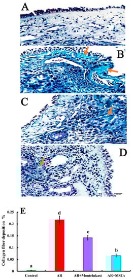 Masson’s trichrome stained sections of the control group (Group I) demonstrated faint and minimal collagen fibers in the lamina propria of the nasal mucosa (Figure 6A). The AR group (Group II) showed marked accumulation of collagen fibers at the basal lamina and lamina propria (Figure 6B). In the AR + Montelukast group (Group III), there were accumulations of collagen fibers at basal lamina and lamina propria was minimally decreased (Figure 6C), while the AR+MSCs group (Group IV) showed minimal collagen fibers in the lamina propria (Figure 6D). The mean area percentage of collagen fibers accumulation for all groups was presented in Figure 6E. There were significant (p < 0.05) increases in the accumulation of collagen fibers in all groups that suffered from AR (Groups II, III and IV) (0.21 ± 0.01, 0.14 ± 0.00, and 0.06 ± 0.00 %; respectively) when compared with the control group (Group I) (00.00 ± 0.00 %). Meanwhile, the deposition of collagen fibers was significantly decreased in the group treated with MSCs (AR + MSCs group) when compared with the AR and AR + Montelukast groups.