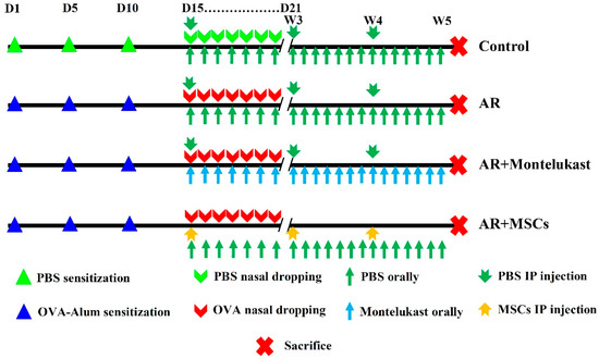 Group IV (AR + MSCs group; n = 6): The rats in the OVA-induced AR model underwent intraperitoneal MSCs injection (1 × 106 MCSs were suspended in 0.5 mL of phosphate buffered saline) weekly for 3 constitutive weeks, starting from day 15 day of the experiment.