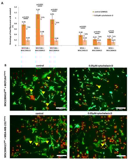 Effect of actin polymerization inhibitor on hybrid cell formation. (A) Initially, 6000 cells per well (50:50) of co-cultures between MSCGFP from three different donors (MSC290115, MSC300415, and MSC280416), as well as MCF10Acherry or MDA-MB-231cherry were started overnight to allow attachment. After 24 h, co-cultures were treated with either 0.05 µM cytochalasin D or a solvent concentration of DMSO, and the percentage of dual fluorescent cells was determined after 24 h of treatment. Data represent the mean ± SD from n = 6, and significances were calculated using a Student′s t-test. (B) Fluorescence microscopy of co-cultures between MSC280416GFP and benign MCF10Acherry neoplastic breast epithelial cells (left panel) and fluorescence microscopy of co-cultures between MSC300415GFP and malignant MDA-MB-231cherry breast cancer cells (right panel) are exemplarily demonstrated in control co-cultures (stimulated with solvent concentration of DMSO), and in the presence of 0.05 µM cytochalasin D for 24 h. Scale bars: 200 µm.