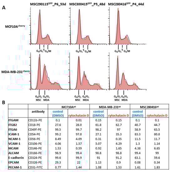 Additional effects of cytochalasin D were analyzed on cell cycle traverse and adhesion molecule expression (Figure 2). The cell cycle progression of co-cultures from the three different MSCGFP populations, together with either MCF10Acherry (Figure 2A, upper panel, grey histograms) or with MDA-MB-231cherry (Figure 2A, lower panel, grey histograms), demonstrated little if any difference compared to a 24 h treatment with 0.05 µM cytochalasin D of the corresponding MSCGFP/MCF10Acherry (Figure 2A, upper panel, red histograms) or MSCGFP/MDA-MB-231cherry co-cultures (Figure 2A, lower panel, red histograms), respectively. These findings suggest a limited involvement of cell cycle progression in cell fusion events between MSC and benign or malignant breast cancer cell populations.