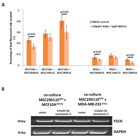Quantification of hybrid cell formation during treatment with CK666 and SMIFH2, as well as PCR analysis of fascin. (A) Dual fluorescent cell formation was evaluated in co-cultures (MSCGFP from three different donors with breast cancer cell populations MCF10Acherry and MDA-MB-231cherry) after 24 h treatment with 100 µM actin-related protein (Arp2/3) complex inhibitor CK666, and 5 µM cell-permeable inhibitor of formin homology 2 (FH2) domains (SMIFH2). Data represent the mean ± SD (n = 6), and significances were calculated by Student´s t-test. (B) Co-cultures of MSC290115GFP with MCF10Acherry and MDA-MB-231cherry, respectively, were stimulated for 24 h with 0.05 µM cytochalasin D, and expression of fascin was examined by PCR analysis. Transcript levels of GAPDH served as a control.