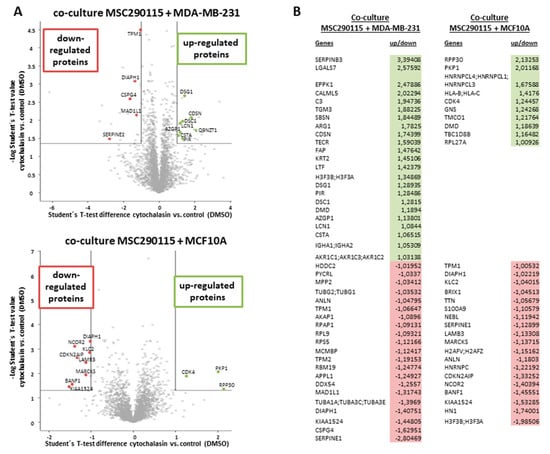 Consequently, a whole proteomic analysis was examined with co-cultures of MSC290115GFP and MDA-MB-231cherry (Figure 4A, upper histogram), as well as co-cultures of MSC290115GFP together with MCF10Acherry (Figure 4A, lower histogram) after 24 h of stimulation with 0.05 µM cytochalasin D, which were compared to DMSO solvent control co-cultures, respectively. The results are presented in a volcano plot demonstrating up-regulated (green area and selected spots) and down-regulated proteins (red area and selected spots) (Figure 4A). All significantly altered proteins are summarized in a table (Figure 4B). Thus, in cytochalasin D-treated MSC290115/MDA-MB-231 co-cultures, 23 proteins were up-regulated and 21 proteins were down-regulated versus the control co-cultures (Figure 4B, left panel). Moreover, inhibition of actin polymerization in co-cultures of the same MSC290115 with MCF10A cells revealed 10 up-modulated and 19 down-modulated proteins (Figure 4B, right panel). Of interest, a variety of actin-associated proteins, including anilin, tropomyosin 1 and 2, tubulin, and DIAPH1 (diaphanous-related formin 1) were downregulated, and DMD (dystrophin) was upregulated in the presence of cytochalasin D.