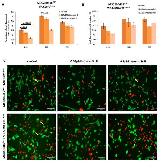 Besides the inhibition of actin polymerization by the binding of cytochalasin D to the barbed end of actin filaments, latrunculin B also represents a potent inhibitor of actin polymerization by binding to actin monomers []. Treatment of MSC280416GFP/MCF10Acherry co-cultures with different concentrations of latrunculin B for up to 72 h resulted in significantly decreased cell fusion (Figure 5A). Similar data with reduced hybrid cell formations were observed in MSC280416GFP/MDA-MB-231cherry co-cultures after latrunculin B exposure (Figure 5B). An altered morphology and reduction in the number of fusion cells is demonstrated by fluorescence microscopy images of control co-cultures compared to latrunculin B-treated co-cultures, whereby the appearance of dual fluorescent cells is highlighted with yellow arrows (Figure 5C).
