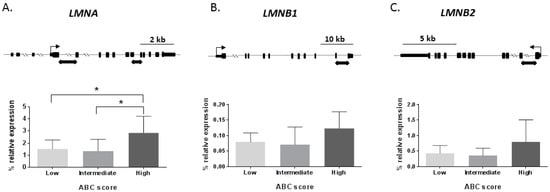 mRNA levels of lamin genes across Alzheimer’s disease (AD) stages. AD hippocampal samples were sorted in three levels [low (n = 14), intermediate (n = 6), and high (n = 8)] of AD neuropathological severity based on ABC score. According to that, mRNA expression levels are shown for each group and gene by bar graphs. The upper row shows the map for each gene. Where black squares represent exons, the thin arrow represents transcription start site for each gene; black rectangular arrow-boxes below the gene map denote amplicons of the RT-qPCR. (A) The LMNA gene graph shows a significant increase in expression among ABC stages. (B) A statistical tendency (p-value = 0.052) across ABC stages was found for the LMNB1 gene, the high ABC stage being the one with highest expression. (C) The LMNB2 gene did not show any difference between ABC stages. Boxes represent percentage of lamin genes expression relative to the geometric mean of GAPDH and ACTB housekeeping genes expression levels. Bars represent the standard error of the mean. * p-value < 0.05.