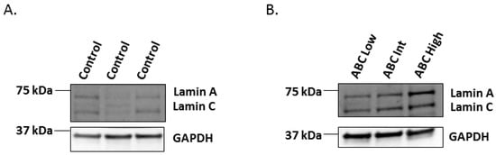 To explore whether increased mRNA levels of LMNA in the high ABC stage of AD also affect protein levels, a Western blot analysis was completed. Protein extracts from frozen hippocampal samples included in the RT-qPCR experiment were obtained and a mouse monoclonal antibody which recognizes an epitope between residues 319–566 of pre-lamin A/C was used. This antibody reacts with both lamin A and lamin C proteins. Since lamin A protein expression is thought to be low in the brain and even lower compared to lamin C [], we first tested whether both lamin A and lamin C were present in the normal human hippocampus. We found that control hippocampal samples showed similar protein expression levels for both lamin A and lamin C, as shown in Figure 2A. Next, we tested lamin A and lamin C protein expression levels across the three ABC stages of AD. In line with the results of LMNA mRNA levels, we observed that both lamin A and lamin C isoforms were increased in the high ABC stage of AD, as shown in Figure 2B.