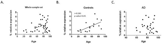 In addition to LMNA gene mutations causing progeria syndromes characterized by premature aging, it has been described that LMNA mRNA expression increases with aging in human muscle [] and is associated with specific age-related phenotypes in the normal population, such as vascular aging []. Moreover, whole genome sequencing and GWAS relate LMNA gene polymorphism rs915179 to extreme longevity [,]. Thus, we explored the relationship between lamin genes mRNA expression and age in our set of samples. When analyzing correlations between lamin gene expression levels and age for the global set of samples, no differences were found, as shown in Table 1 and Figure 3A. A statistically significant positive correlation was observed between LMNA mRNA levels and age within the group of controls, as shown in Table 1 and Figure 3B. However, this relationship was no longer shown in the AD group, as shown in Table 1, Figure 3C.
