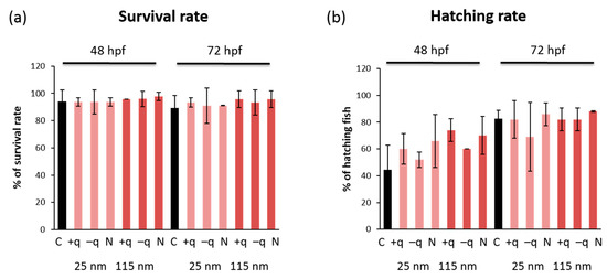 The effect of exposure to SiO2 NPs on the development of zebrafish embryos. (a) Survival rate and (b) hatching rate after exposure to 100 mg/L of 25- or 115-nm SiO2 NPs with different surface charges at 48 and 72 hpf. Data are represented as mean ± SD (standard deviation).