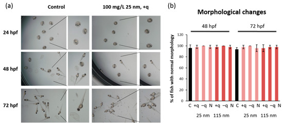 The effects of SiO2 NPs on gross morphological features of zebrafish embryos. (a) Representative images of embryos exposed to positively charged SiO2 NPs (25 nm) at 100 mg/L and (b) gross morphological changes after the exposure to 100 mg/L of 25 or 115 nm SiO2 NPs at 48 and 72 hpf. Data are represented as mean ± SD.