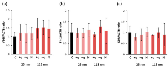 Gene expression of VEGFa and VEGF receptors in zebrafish. Expression levels of (a) VEGFa and VEGF receptors: (b) Flt-1 and (c) KDR in embryos exposed to 100 mg/L of 25 or 115 nm SiO2 NPs with different surface-charge at 48 and 72 hpf. The mRNA levels were normalized by the amount of β-action mRNA. Data are represented as mean ± SD.