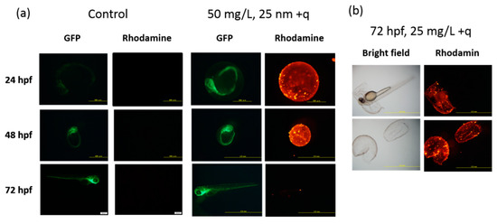 Representative fluorescence microscopy images of zebrafish embryos. (a) Images of embryos exposed to 0 (control) or 50 mg/L of positively charged SiO2 NPs (25 nm) at 24, 48, and 72 hpf and (b) embryos exposed to 25 mg/L of positively charged SiO2 NPs (25 nm) at 72 hpf.