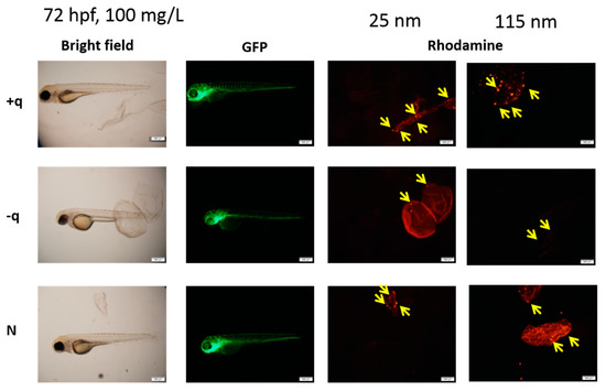 In the present study, the in vivo effects of SiO2 NPs with three different surface charges were studied. We used rhodamine-labeled SiO2NPs 25 and 115 nm in diameter with hydroxyl function on the surface (pristine, neutral surface charge; N) or functionalized with amino (positive surface charge; +q) or carboxyl groups (negative surface charge; −q). The intensity-weighted hydrodynamic average diameters of dispersed NPs were determined by the dynamic light scattering (DLS) technology. Table 1 shows the mean hydrodynamic diameters and polydispersity index (PdI) of SiO2 NPs in embryo culture medium. The hydrodynamic average diameters of amino-, carboxyl-, and hydroxyl-modified 25 nm SiO2 NPs were 171.3 ± 8.58, 166.8 ± 2.05, and 132.2 ± 6.99 nm, respectively (Table 1), indicating that NPs were aggregated or agglomerated in the medium. Although DLS data provided the mean hydrodynamic diameters of >100 nm, the presence of nano-sized particles was confirmed in the medium (Table 1). The average hydrodynamic diameters of 115-nm SiO2 NPs were 228.9 ± 5.06, 152.7 ± 1.19, and 127.2 ± 1.10 nm for amino-, carboxyl-, and hydroxyl-modified, NPs respectively (Table 1). Hydrodynamic sizes of all NPs dispersed in the embryo medium did not change after 24 h.
