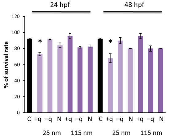 Survival rate at 24 and 48 hpf in zebrafish embryos exposed to 100 mg/L of 25 or 115 nm SiO2 NPs with different surface charges after chemical removal of chorion at 6 hpf. Data are represented as mean ± SD. * p < 0.05 compared with the control (ANOVA followed by Dunnett’s multiple comparison test).