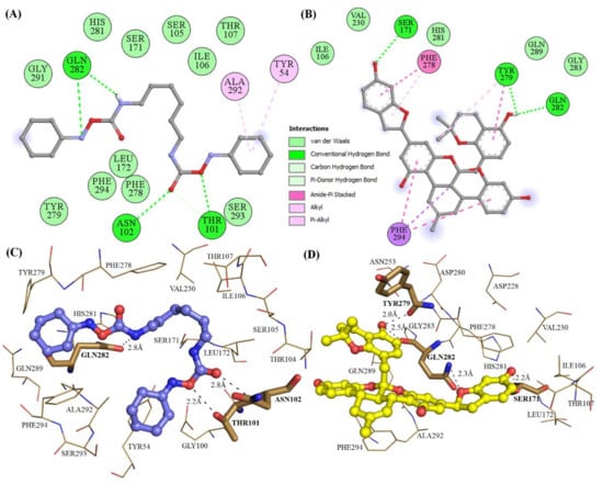 Catalytic pocket’s residue interactions of Mrlip1 with compounds. (A–B) 2D diagram of Mrlip1 residues interacting with compound RHC80267 and ZINC85530919 respectively. (C–D) 3D view of binding pocket residues of Mrlip1 interacting with compound RHC80267 and ZINC85530919 respectively. (Bold-labeled residues in stick model: forming polar contacts with the ligands and residues showing in lines participating in other interactions).