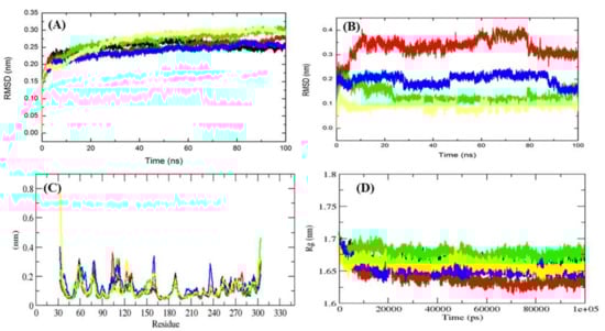 Binding of a compound in the catalytic pocket of the protein can lead to large conformational variations in a protein [18,19,20]. Root mean square deviation (RMSD) is one of the most important fundamental properties for establishing whether the protein is stable and close to the experimental structure [21]. The average RMSD values for free Mrlip1, Mrlip1-RHC80267, Mrlip1-ZINC85530919, Mrlip1-ZINC95914464 and Mrlip1-ZINC85530320 were found to be 0.25 nm, 0.21 nm, 0.27 nm, 0.20 nm, and 0.28 nm, respectively (Table 4).