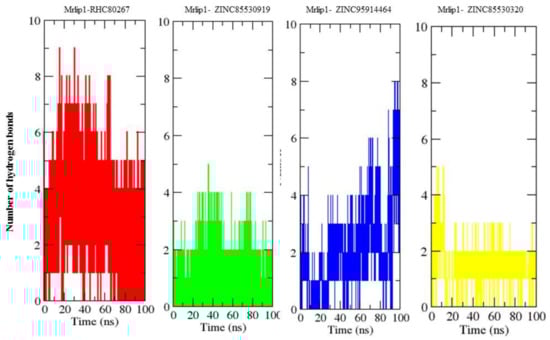 Hydrogen bonding between a protein and compounds provides a directionality and specificity of interaction that is an important aspect for molecular recognition [23]. In order to validate the stability of the docked complexes, the hydrogen bonds paired within 0.35 nm between Mrlip1 and compounds in Mrlip1-RHC80267, Mrlip1-ZINC85530919, Mrlip1-ZINC95914464 and Mrlip1-ZINC85530320 were calculated in a solvent environment during the MD simulations. We found that RHC80267 and ZINC95914464 strongly bound to the active pocket of Mrlip1 with 2–6 hydrogen bonds, while ZINC85530919 and ZINC85530320 bound to the active pocket of Mrlip1 with 1–3 hydrogen bonds with least fluctuations (Figure 7).