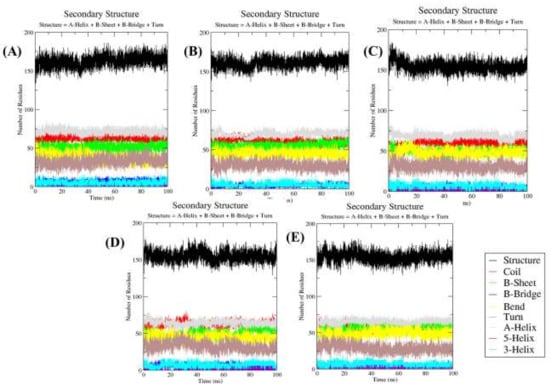 Secondary structure plot. The secondary structure analysis indicating the structural elements present in (A) Mrlip1, (B) Mrlip1-RHC80267, (C) Mrlip1-ZINC85530919, (D) Mrlip1-ZINC95914464, and (E) Mrlip1-ZINC85530320 during the 100 ns MD simulations.
