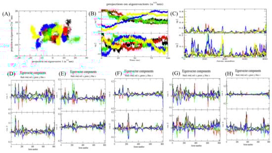 Principal Component Analysis. (A) The 2D projections of trajectories on eigenvectors showed different projections of Mrlip1. (B) The projections of trajectories on eigenvectors with respect to time. (C) Root mean square atomic fluctuations (RMSF) obtained during PCA calculations. Black, red, green, blue and yellow colour represent values obtained for Mrlip1, Mrlip1-RHC80267, Mrlip1-ZINC85530919, Mrlip1-ZINC95914464 and Mrlip1-ZINC85530320 respectively. The Eigenvector components were further resolved for Mrlip1 into total (black), x (red), y (green), and z (blue) directions for (D) Mrlip1, (E) Mrlip1-RHC80267, (F) Mrlip1-ZINC85530919, (G) Mrlip1-ZINC95914464, and (H) Mrlip1-ZINC85530320, respectively.