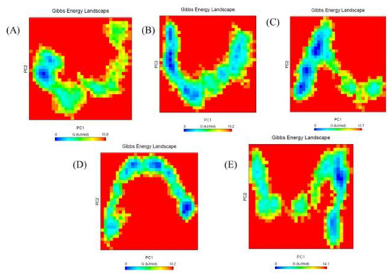 The Gibbs free energy landscape. The Gibbs free energy landscape plot obtained during 100 ns MD simulations for (A) Mrlip1, (B) Mrlip1-RHC80267, (C) Mrlip1-ZINC85530919, (D) Mrlip1-ZINC95914464, and (E) Mrlip1-ZINC85530320 respectively.