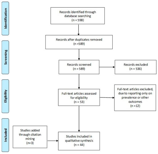 A systematic search of the literature was performed in Pubmed/Medline, Embase, and Cochrane Central databases on the 1 December 2018, from 2006 until that date (Supplementary Materials). The keywords employed and combined for the search strategy were: “In-Vitro Fertilization”, “IVF”, “Assisted Reproduction”, “Assisted Reproduction Techniques”, “Medical Assisted Reproduction”, “Intracytoplasmic Sperm Injection”, “ICSI”, “auto-antibodies”, “antibodies”, “anti-sperm”, “antinuclear antibodies”, “anti-thyroid antibodies”, “autoimmune disorders”, “autoimmunity”. The original search yielded 598 studies from the three databases. Following the removal of duplicate studies (n = 9), all records were screened and full-text was sought and obtained for relevant articles. Relevant articles (n = 53), were identified following title and abstract screening, employing the flow chart of Preferred Reporting Items for Systematic Reviews and Meta-analysis (PRISMA) as presented in Figure 1. Screening and selection of literature was performed independently by three authors. Disagreements between the authors were resolved by an arbitration mediated by the senior authors. Citation mining was performed where the reference lists of all included articles and relevant reviews and metanalyses were reviewed to identify other articles of relevance. The search was limited to full-length manuscripts published in English in peer-reviewed journals up to December 2018. A total of 44 studies were included in the present systematic review. No protocol was submitted to the Prospero International Prospective Register of Systematic Reviews, providing details on conducting of this study.