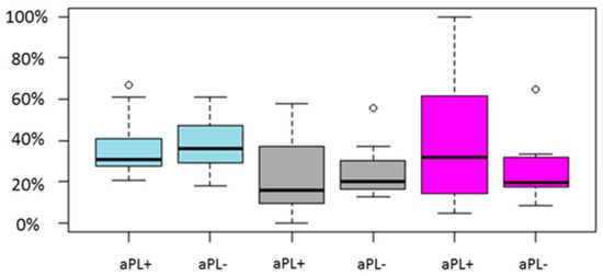 Matsubayashi et al., 2006 b [56]ProspectiveAnti-cardiolipin antibodies, anti-β2-glycoprotein 1 antibody,17 aPL (+) women27 aPL (−) women29.41%33.33%n/an/an/an/a