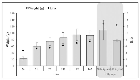 Characterization of developing and fully-ripe Actinidia deliciosa cv Hayward kiwifruits. Columns and circles indicate the fruit weight (grams) and the degrees Brix (percentage soluble sugar). The gray box shows the fully-ripe fruits. Data are means and standard deviations (n = 3), daa = days after anthesis.