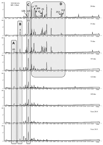 The samples were powdered in liquid nitrogen and methanol extracts were analyzed by untargeted metabolomics (UPLC-qTOF). The base peak chromatograms clearly showed the profound changes in the secondary metabolome during kiwifruit development (Figure 2).