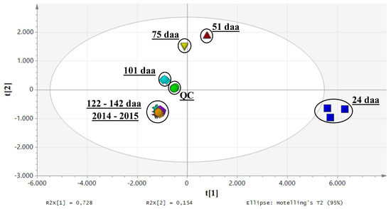 The high-resolution untargeted metabolomics analysis produced a data matrix comprising 521 putative compounds, 81 of which were tentatively annotated (Supplementary File 1). The dataset was submitted to PCA analysis and the first and second principal components, explaining the 88.2% of the total variance, showed sample clustering according to the developmental stage (Figure 3).