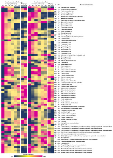 Heat map showing the average relative abundance as a proportion of fresh weight (calculated from the dataset in Supplementary File 1) and the average relative abundance per fruit (obtained by normalizing the relative abundance as a proportion of fresh weight by the average fruit weight) of all the metabolites tentatively identified during fruit development and in fully-ripe fruits, the latter from two different growing seasons. The metabolite identification numbers (ID) match those in the dataset. The color code ranges from blue (lowest relative abundance to magenta (highest relative abundance). Abbreviations: Co = coumarins; Ch = chalcones; FL = flavonoids; F-p = flavan-3-ols and procyanidins; HB = hydroxybenzoic acid derivatives; HC-d = hydroxycinnamic acid derivatives; OA = other organic acids. * The m/z and fragmentation pattern of the terpene moiety was compatible with linalool, nerol or geraniol.