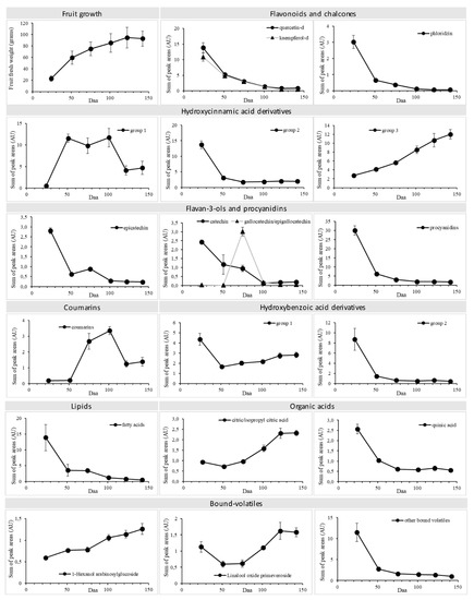 Fruit growth curve and relative abundance (means ± standard deviation) of selected metabolites/groups of metabolites during fruit development. The original dataset (Supplementary File 1) was autoscaled (UV). The IDs are the same as shown in Figure 4. Hydroxycinnamic acids, group 1: ID 9 caffeic acid hexose, ID 15 caffeic acid hexose, ID 7 caffeic acid hexose derivative, ID 468 caffeic acid hexose derivative, ID 14 caffeoyl hexose derivative, ID 525 caffeoyl hexose derivative, ID 470 caffeoyl hexose, ID 4 caffeoyl sucrose, ID 185 linocinnamarin (methyl coumaric acid glucoside). Hydroxycinnamic acids, group 2: ID 104 caffeoyl quinic acid, ID 529 coumaroyl aspartic acid, ID 129 coumaroyl quinic acid, ID 83 N-feruloylaspartic acid, ID 12 ferulic acid hexose formic adduct. Hydroxycinnamic acids group 3: ID 130 coumaroyl quinic acid derivative, ID 482 ferulic acid derivative, ID 224 ferulic acid hexose, ID 13 feruloyl quinic acid, ID 163 dihydroferulic acid derivative, ID 167 dihydroferulic acid derivative, ID 399 dihydroferulic acid derivative, ID 408 dihydroferulic acid derivative, ID 454 dihydroferulic acid derivative, ID 447 dihydrocaffeic acid derivative. Hydroxybenzoic acids group 1: ID 10 vanillic acid derivative, ID 88 dihydroxybenzoic acid hexose, ID 339 4 hydroxy-3-(3-methyl-2-buten-1-yl) benzoic acid. Hydroxybenzoic acids group 2: ID 113 benzoyl glucuronide; ID 126 benzoyl glucuronide, ID 538 galloylglucose.