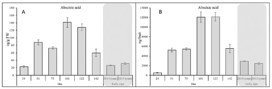 The application of high-resolution UPLC-MS in the untargeted metabolomics approach allowed the detection of ABA in the developing fruits (Figure S1 in Supplementary File 2). This phytohormone is known to be involved in fruit development and ripening [31,32] and therefore we investigated the accumulation of this important molecule in relation to kiwifruit development. Although we detected ABA in the original methanol extracts, we also applied a specific extraction protocol to allow more precise measurements [33]. The sensitive UPLC-MS method allowed us to detect ABA at the first sampling point (24 daa) at a concentration of 22.94 ng/g FW, followed by an increase at 51 daa and then a decrease at 75 daa (Figure 6A). However, when the values were normalized to the fruit weight, the difference between these two phases was eliminated (Figure 6B). Similarly, we observed an ABA peak at 101 daa followed by a slight decline at 122 daa (Figure 6A) but the difference was eliminated when the fruit weight was taken into account (Figure 6B). The levels of ABA declined after 122 daa, reaching a value higher than that observed at 24 daa. Significant ABA quantities were still observed in fully ripe fruits.