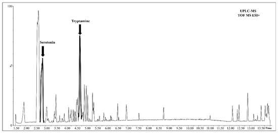 UPLC-MS chromatogram of metabolites in positive ionization mode. The arrows indicate serotonin and tryptamine, whose abundance is indicated by the high peaks.