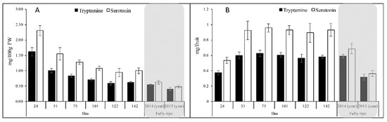 As a proportion of fruit fresh weight, the levels of tryptamine and serotonin were very high at the earliest sampling point (24 daa) indicating that the synthesis of these compounds is activated following anthesis. The content of both metabolites then declined progressively, leveling off at 101 daa. In fully-ripe fruits, both tryptamine (0.48 ± 0.04 g/100 g FW) and serotonin (0.55 ± 0.05 g/100 g FW) levels were assessed, indicating that kiwifruits ready-to-eat accumulate these two indolamines (Figure 8A). When considered in terms of quantity per whole fresh fruit with the skin removed, the initial levels of serotonin and tryptamine increased following anthesis and then remained fairly stable from 51 days onwards (Figure 8B). Interestingly, in the fully-ripe fruits, the tryptamine and serotonin levels were influenced by the growing season: in 2015 the levels of both tryptamine and serotonin declined respect to 2014.
