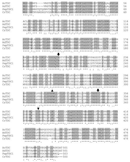 Clustal Omega alignment of Achn173261, AdTDC11, PepTDC1, and CrTDC amino acid sequences. Gray boxes indicate conserved residues. Symbols indicate the putative pyridoxal phosphate-binding site (triangle), the putative catalytic residues (arrows), and the putative substrate selectivity residue (inverted triangle).