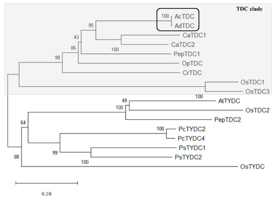 The amino acid sequences of some functionally characterized TDCs, together with another class of AADC, i.e., the tyrosine decarboxylases (TYDCs), were used to construct a phylogenetic tree (Figure 10). Achn173261 and AdTDC clustered in the TDC clade, indicating these two genes were highly likely to encode TDCs rather than TYDCs.