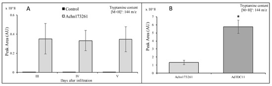 HPLC-ESI/MS analysis confirming the presence of tryptamine in infiltrated Nicotiana benthamiana plants. (A) Tryptamine content in N. benthamiana leaves 3, 4, and 5 days after infiltration with pK7WG2.Achn173261. (B) Tryptamine content in infiltrated N. benthamiana leaves 4 days after infiltration with either pK7WG2.Achn173261 or pK7WG2.AdTDC11 (* p < 0.01).