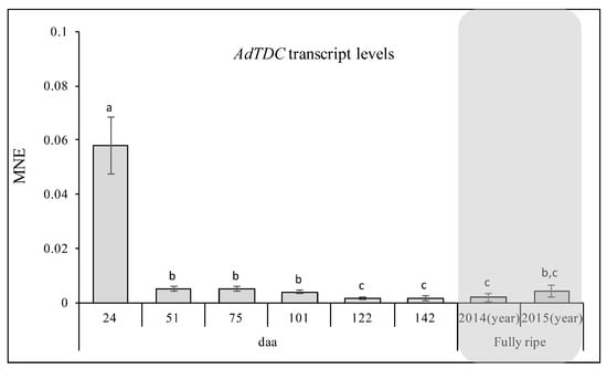 Expression level of the AdTDC gene determined by quantitative RT-PCR during kiwifruit development and ripening. Different letters refers to significant differences between the samples according to Student’s t-test (a,b p < 0.01; b,c p < 0.05). daa = days after anthesis; MNE = mean normalized expression.