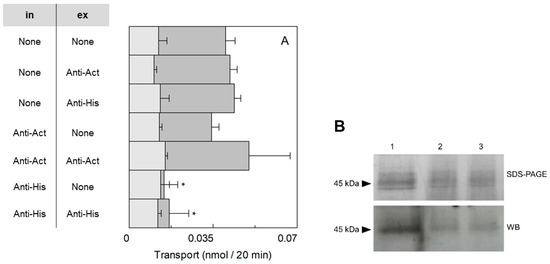 Sidedness of the reconstituted Solanum lycopersicum CAT2 (SlCAT2) in proteoliposomes. (A) SlCAT2 was purified and reconstituted in proteoliposomes as described in Section 4.4. The purified protein was preincubated or not, for 30 min under rotatory shaker at room temperature, with 6 µg of anti-His or anti-Actin antibody, as indicated in the table (in; intraliposomal compartment). Transport was measured in 20 min, as described in Section 4.5, by adding 100 μM [3H]Arg to proteoliposomes containing 200 mM sucrose and 15 mM ATP at pH 7.5. In the external compartment, 0.6 µg of anti-His or anti-Actin were added or not, as indicated in the table (ex; extraliposomal compartment). The transport in proteoliposomes (dark gray bars) and in liposomes (light gray bars) is measured as nmol of radioactive substrate taken up in 20 min. Results are the means ± SD from three experiments. (*), significantly different from the control (none) for p < 0.05 as calculated from 1-way ANOVA test. (B) Sodium dodecyl sulfate polyacrylamide gel electrophoresis (SDS-PAGE) of 0.15 µg purified SlCAT2 (lane 1) and the corresponding protein volume of SlCAT2 reconstituted in proteoliposomes not preincubated with antibody (lane 2), after preincubation with anti-His antibody (lane 3). Proteoliposomes were purified by size-exclusion chromatography as described in Section 4.5 prior to SDS-PAGE run.