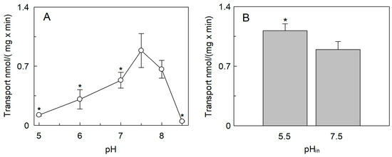 Effect of pH on the transport activity of SlCAT2 in proteoliposomes. SlCAT2 was purified and reconstituted in proteoliposomes as described in Section 4.4. (A) Transport rate (nmol/(mg × min)) was measured in 10 min, as described in Section 4.5, by adding 100 μM [3H]Arg to proteoliposomes containing 200 mM sucrose and 15 mM ATP. The pH was kept equal in both the internal and external site of proteoliposomes. (B) To generate the pH gradient, transport was measured in 10 min, as described in Section 4.5, by adding 100 μM [3H]Arg (pH 7.5) to proteoliposomes prepared using the buffer at pH 7.5 or pH 5.5, as indicated (pHin) and containing 200 mM sucrose and 15 mM ATP. Results are the means ± SD from three experiments. (*), Significantly different, from the control at pHin 7.5, for p < 0.05 as calculated from the Student’s t-test analysis.