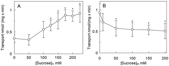 Effect of osmotic pressure on the transport activity of SlCAT2 in proteoliposomes. SlCAT2 was purified and reconstituted in proteoliposomes as described in Section 4.4. (A) Transport rate (nmol/(mg × min)) was measured in 10 min, as described in Section 4.5, by adding 100 μM [3H]Arg to proteoliposomes containing indicated concentrations of sucrose and 15 mM ATP, at pH 7.5. (B) Transport rate was measured in 10 min, as described in Section 4.5, by adding 100 μM [3H]Arg together with indicated concentrations of sucrose to proteoliposomes containing 200 mM sucrose and 15 mM ATP, at pH 7.5. Results are the means ± SD from three experiments. (*), Significantly different from the control (without sucrose in both (A) and (B)) for p < 0.05 as calculated from Student’s t-test analysis.