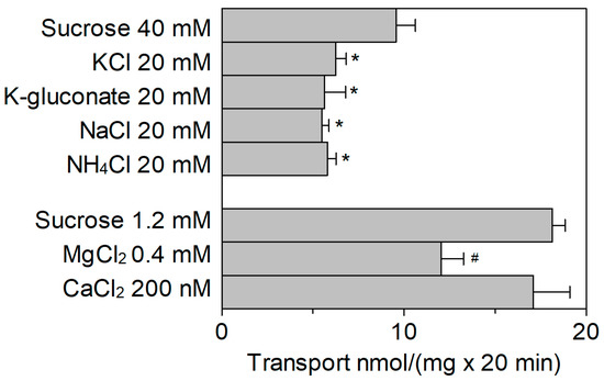 Effect of extraliposomal cations on the transport activity of SlCAT2. SlCAT2 was purified and reconstituted in proteoliposomes as described in Section 4.4. Transport was measured in 20 min, as described in Section 4.5, by adding 100 μM [3H]Arg together with the indicated compounds to proteoliposomes containing 200 mM sucrose and 15 mM ATP, at pH 7.5. Concentrations were chosen according to the average concentrations of cations in the cytosol. Results are the means ± SD from four experiments. (*), significantly different from the control (sucrose 40 mM) for p < 0.05 as calculated from 1Way ANOVA test. (#), significantly different from the control (sucrose 1.2 mM) for p < 0.05 as calculated from 1-way ANOVA test.