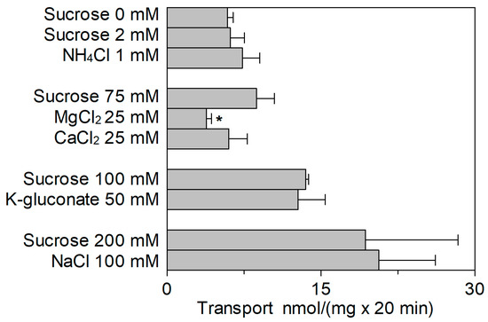 Effect of intraliposomal cations on the transport activity of SlCAT2. SlCAT2 was purified and reconstituted in proteoliposomes as described in Section 4.4. Transport was measured in 20 min, as described in Section 4.5, by adding 100 μM [3H]Arg to proteoliposomes containing indicated concentrations of sucrose or cations and 15 mM ATP, at pH 7.5. Concentrations were chosen according to the average concentrations of cations in the vacuolar lumen. Results are the means ± SD from four experiments. (*), Significantly different from the control (isoosmotic concentration of sucrose for each category of cations) for p < 0.05 as calculated from 1-way ANOVA test.