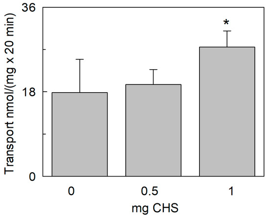 Effect of cholesteryl hemisuccinate (CHS) on the transport activity of SlCAT2. SlCAT2 was purified and reconstituted in proteoliposomes as described in Section 4.4. Transport was measured in 20 min, as described in Section 4.5, by adding 100 μM [3H]Arg to proteoliposomes containing 200 mM sucrose and 15 mM ATP at pH 7.5. Proteoliposomes are prepared without CHS or with 0.5 mg or 1 mg CHS in 1 mL of proteoliposomes as described in Section 4.6. Results are the means ± SD from four experiments. (*), significantly different from the control (condition with no addition of CHS) for p < 0.05 as calculated from Student’s t-test analysis.