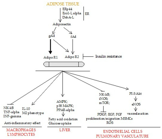 A growing body of research has documented that adiponectin has pleiotropic effects on inflammation and cell proliferation [36,37,38,39,40]. Whereas most adipose-tissue adipocytokines typically promote pro-inflammatory pathways, adiponectin has been proved to have anti-inflammatory activities [41,42,43]. Many inflammatory cells including macrophages, NK cells, lymphocytes, as well as pulmonary epithelial cells present receptors for adiponectin on their surface [44]. In vitro studies on macrophages have shown that adiponectin inhibits the activation of the NF-κβ [44,45] molecular pathway, reducing the phagocytic activity and the production of Interferon gamma (INF-γ) and TNF-α [46,47,48] and also stimulating the differentiation of macrophages toward the M2 phenotype [49,50]. In addition, adiponectin increases the production of cytokines with anti-inflammatory activity in lymphocytes—such as IL-10 [47]—and has the ability to bind some circulating chemokines by inhibiting their pro-inflammatory action [24,51]. Adiponectin also acts at the level of the endothelial cells by inhibiting the NF-κβ mediated activation, reducing the expression of adhesion molecules [52]. An important alteration found at the level of the vascular structure in pulmonary hypertension is the obliteration of the lumen of the small arteries secondary to the migration of mesenchymal smooth muscle cells (MSMCs). The MSMCs migration signaling is activated by several growth factors, such as platelet-derived growth factor (PDGF), epidermal growth factor (EGF), and vascular endothelial growth factor (VEGF) [10,53,54,55,56]. Although a specific role for adiponectin in the regulation of growth factors is not described, several effects on vascular remodeling have been demonstrated [41,57,58,59]. In vitro, adiponectin suppresses the proliferation and migration of smooth muscle cells (SMCs) [60]. Similarly, in vivo, mice with adiponectin-secretion deficiency develop a pathological accumulation of SMCs at the level of small-caliber vessel walls of the pulmonary circle [57]. Finally, adiponectin also plays a role in the modulation of vascular tone. Adiponectin has a direct vasodilator action [61,62]. Experimental studies show that adiponectin-deficient mice develop systemic arterial hypertension [63].