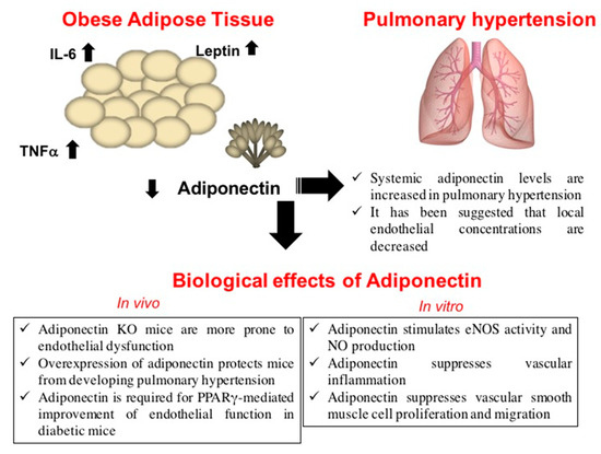 Pulmonary hypertension (PH) is a clinical condition characterized by an increase in pulmonary vascular resistance, which may result in heart failure. PH is defined as an increase in the mean pulmonary arterial pressure (mPAP) ≥ 25 mmHg at rest as assessed by right-heart catheterization (RHC) [1,2]. PH hallmarks include medial hypertrophy with an increase in the number and size of pulmonary arterial smooth muscle cells (PASMCs), intimal proliferation, fibrinoid necrosis, and finally, albeit uncommon, plexiform lesions [1]. Factors including individual susceptibility and metabolic status may influence the onset and development of the main changes in pulmonary vessels [3]. Pulmonary Hypertension is categorized into five groups [2]. Group 1, pulmonary arterial hypertension (PAH), comprises the idiopathic and hereditary forms of pulmonary hypertension. The term PAH refers to the presence of pre-capillary PH, defined by a pulmonary artery wedge pressure (PAWP) ≤ 15 mmHg and a pulmonary vascular resistance more than 3 Wood units (WU) in the absence of other causes of pre-capillary PH. This group also includes forms related to the human immunodeficiency virus, liver cirrhosis, connective-tissue disease, and congenital heart disease, as well as drug-induced PAH. Group 2 includes forms of pulmonary hypertension related to left-sided heart disease. Group 3 comprises pulmonary hypertension associated with lung diseases. Group 4 includes chronic thromboembolic disorders associated with chronic PH. In chronic thromboembolic pulmonary hypertension (CTEPH), the presence of organic thrombi causes the increase in pulmonary arterial pressure, with pulmonary vessel remodeling leading to right-ventricular failure. Group 5 includes heterogeneous conditions which are not considered part of the previous groups (sarcoidosis or myeloproliferative disorders). This review examines the current data linking obesity with the different forms of pulmonary hypertension, with a focus on the biological activities mediated by adiponectin.