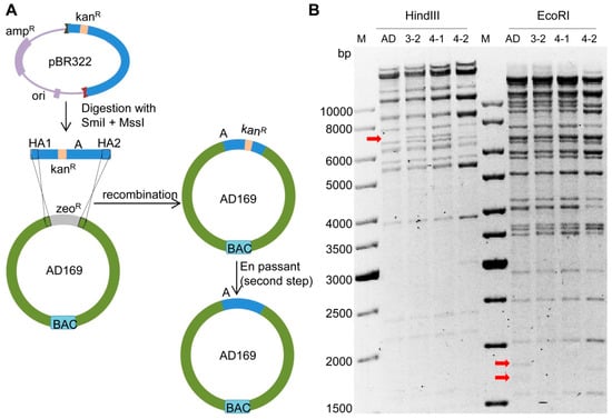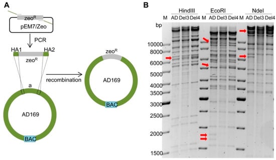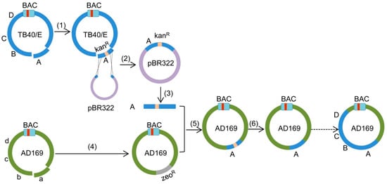 - Borst, E.M.; Hahn, G.; Koszinowski, U.H.; Messerle, M. Cloning of the human cytomegalovirus (HCMV) genome as an infectious bacterial artificial chromosome in Escherichia coli: A new approach for construction of HCMV mutants. J. Virol. 1999, 73, 8320–8329. [Google Scholar] [PubMed]