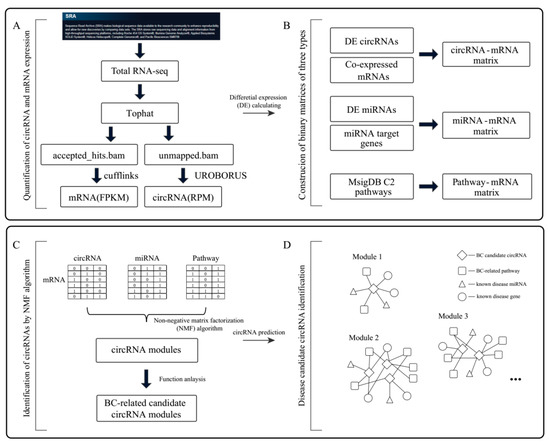 Increasing numbers of disease-related molecular biomarkers, including gene, protein, miRNA, lncRNA, and circRNA could provide more promises to improve the diagnosis and treatment for BC patients [34,35,36]. However, relatively incomplete disease information about circRNA brings a challenge to biological researchers to uncover their functional mechanisms and roles. Towards this end, we developed a computational pipeline with the goal of identifying BC-related circRNA modules by integration of circRNA, mRNA, miRNA, and pathway data based on an NMF algorithm in this work. Our approach integrated known disease information and omics data, whereby we could identify BC candidate circRNAs and infer their functional roles.