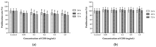 Figure 2. Effects of chitosan oligosaccharides (COS) on the proliferation of A549 and HL-7702 cells. (a) Proliferation rate of A549 cells measured by 3-(4,5-dimethylthiazol-2-yl)-2,5-diphenyl tetrazolium bromide (MTT) test. (b) Proliferation rate of HL-7702 cells measured by MTT test. Data represents mean ± SD, n = 6, * p < 0.05 significant difference compared with control group.