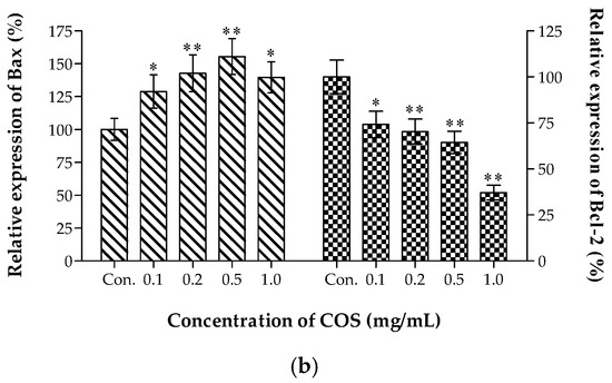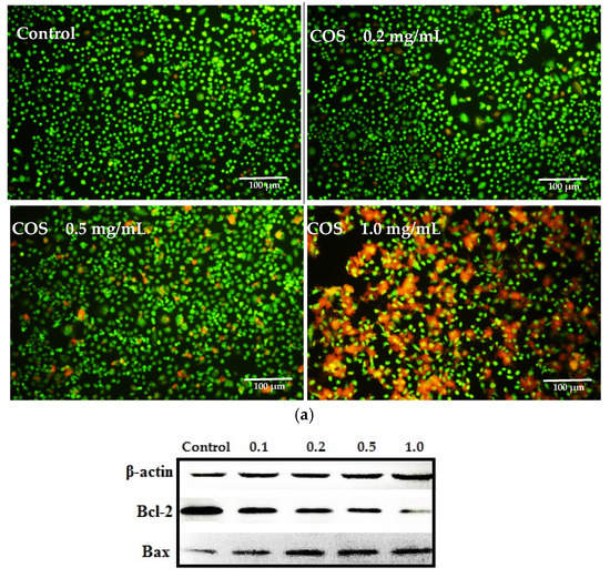 The inhibition of tumor growth has been a continuous effort in cancer treatment [39]. Growth reduction and death induction are two major means to inhibit tumor growth [40]. The effects of COS on cell viability were evaluated with live dead staining assay [41] on human lung cancer A549 cells. Healthy cells were stained by the cell-permeable Calcein-AM and fluoresced green, while dead cells were stained by the cell non-permeable PI (red) and appeared red. Low-dose COS (less than 0.2 mg/mL for 24 h) had slight toxic effects on the viability of A549 cells, while it was worthy to note that cell viability was highly affected by high-dose COS (0.5–1.0 mg/mL for 24 h) (Figure 3a). Members of the B cell lymphoma 2 (Bcl-2) gene family have a central role in regulating programmed cell death by controlling pro-apoptotic and anti-apoptotic intracellular signals. In cancer, apoptosis evasion through dysregulation of Bcl-2 genes is a recurring event [42]. As a pro-apoptotic member of this family of proteins, Bax is a critical regulator of apoptosis [43]. Therefore, we measured protein expressions of Bcl-2 and Bax in A549 cells using western blotting. As shown in Figure 3b, Bax expressed at a low level in the control group but was strongly activated by COS (p < 0.01), whereas the level of Bcl-2 expression was lower in COS-treated groups than that of control groups. Cell death, due to necrosis and apoptosis, was involved in COS treatment. These findings provided evidence that COS could cause significant growth inhibition in A549 human lung cancer cell lines and showed good ability at inducing cell apoptosis.